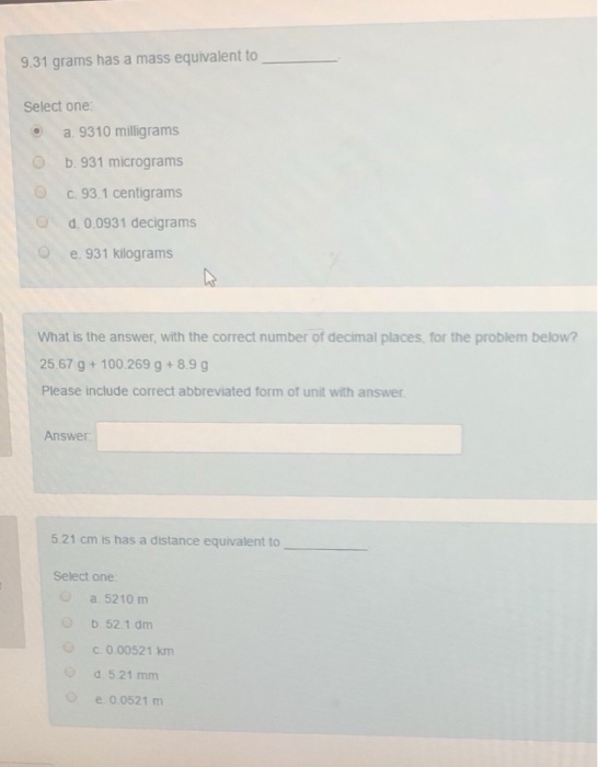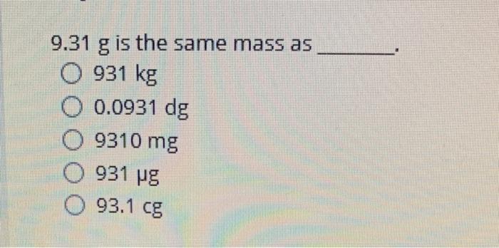 Solved 9 31 G Is The Same Mass As 9310 Mg 931 Ug 931 Kg 0 0931 Dg 93 1cg